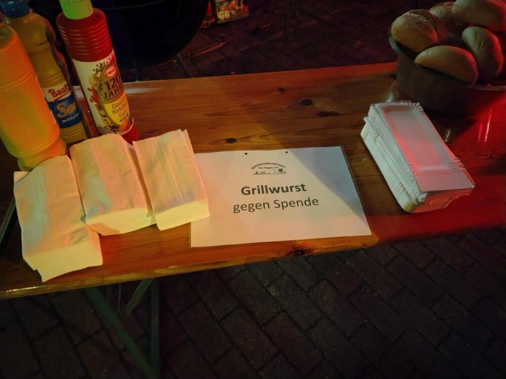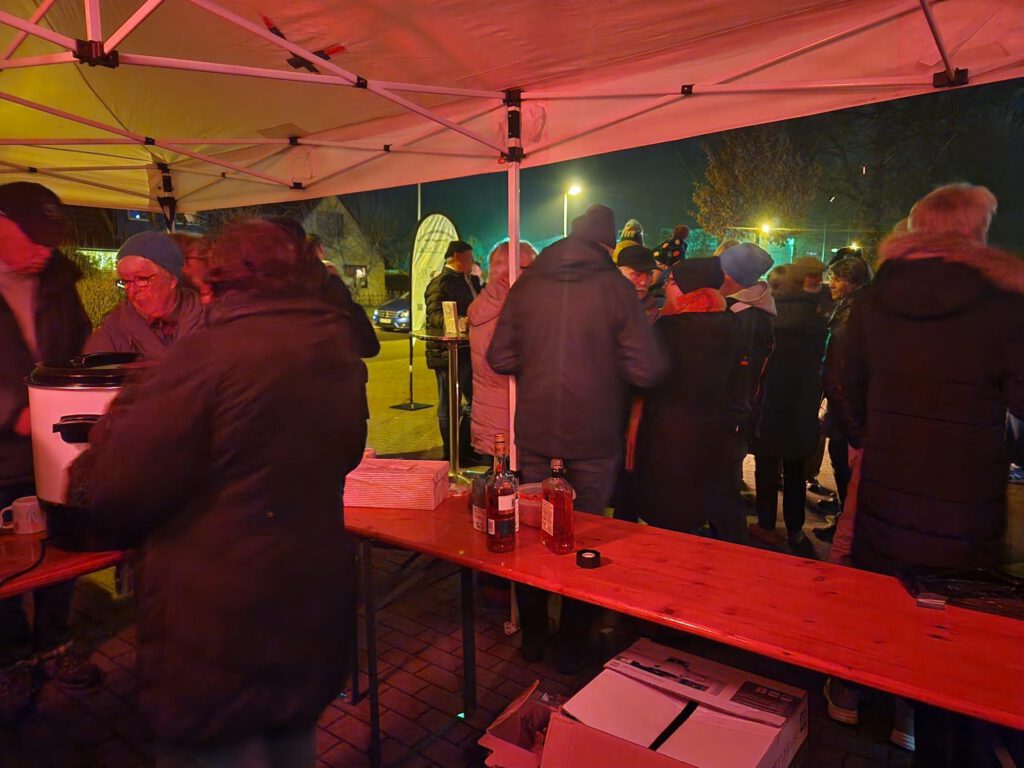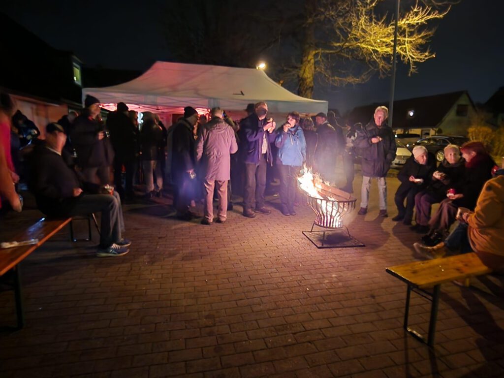 Dieses Jahr meinte es das Wetter gut mit uns. Während es im vergangenen Jahr durchdringende Kälte mit Wind gab, konnte man es diesmal gut aushalten. Die gut 70 Gäste genossen den Abend sichtlich fröhlich. Lediglich zum Schluss kam der typisch norddeutsche Nieselregen auf, den man zwar kaum sieht, aber irgendwann fühlt. Wem es fröstelte, der gönnte sich einen heißen Glühwein und eine Bratwurst oder rutschte dicht an die Feuerschale.